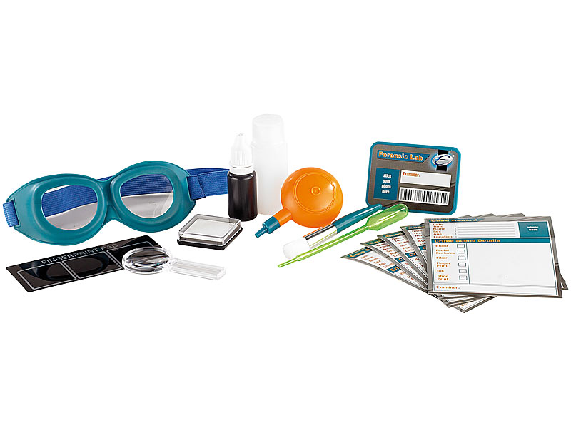 - Inklusive Flasche für Fingerabdruck-Puder (ohne Inhalt), schwarzer Tinte, Stempelkissen, Pinsel, Lupe, schwarzer Film für Fingerabdrücke, Blasebalg, Schutzbrille, Pipette, Namensschild, 5 Fallkarten und deutscher Anleitung