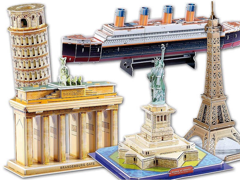 Mit diesem Puzzle-Set zum Vorteilspreis erhalten Sie gleich fünf 3D-Puzzles im Paket: Bauen Sie berühmte Gebäude in 3D nach - Puzzle-Vergnügen in echten drei Dimensionen!Setzen Sie Puzzleteil auf Puzzleteil und sehen Sie, wie Eiffelturm, Freiheitsstatue, Titanic & Co. entstehen.